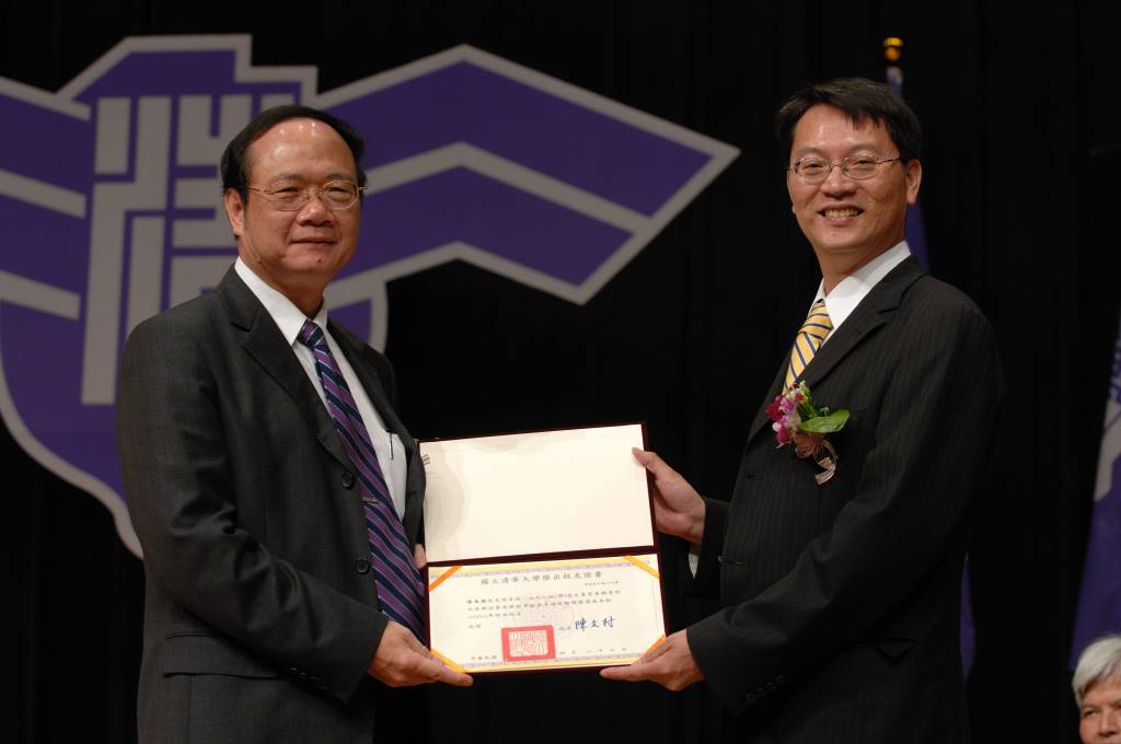 • 陳來助於2008年當選清華大學工學院與校級傑出校友,於校慶時接受陳文村前校長頒獎表揚(清華大學化工系提供)